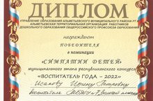 Поздравляем воспитателя Исакову Ирину Петровну с победой в номинации "Симпатии детей" муниципального этапа респубиканского конкурса "Воспитатель года - 2022".