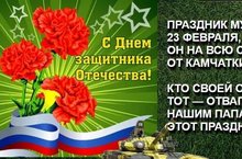 Сердечно поздравляем в день 23 февраля с праздником мужества и отваги — с Днём защитника Отечества. Желаем быть всегда в боевом духе, с отличным настроением и с крепким здоровьем. Пусть всегда удаётся оставаться надёжным и верным защитником Родины, семьи, любимых и дорогих людей!