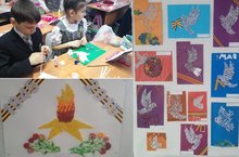 Учащиеся под руководством воспитателя ГПД Ахметшиной Л.В. выполнили работы в технике квилинга, посвященный 70-летию Победы. Учащиеся 3а и 3б классов выбрали тему "Голубь мира", а 2а создали коллективную работу под названием "Вечная память".