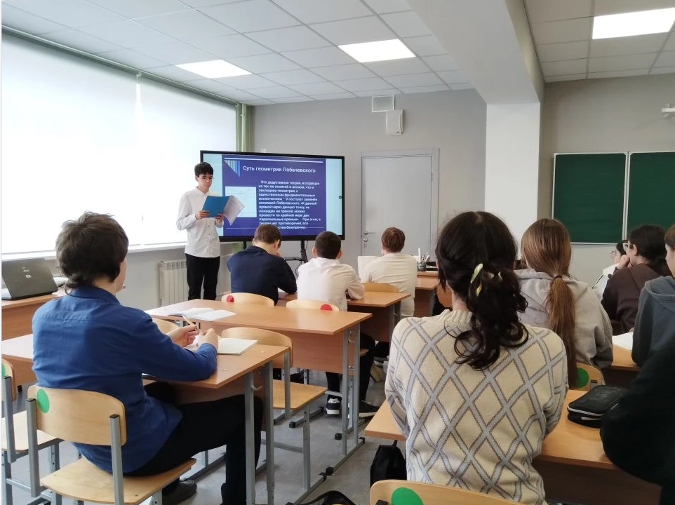 Ульдюкова Валерия и Прокофьев Радмир выступили с лекцией "Жизнь и деятельность великого ученого". Смотрели фильм "Загадка пятого постулата". Ребята узнали об истории открытии, перевернувшего представления и пространстве. -