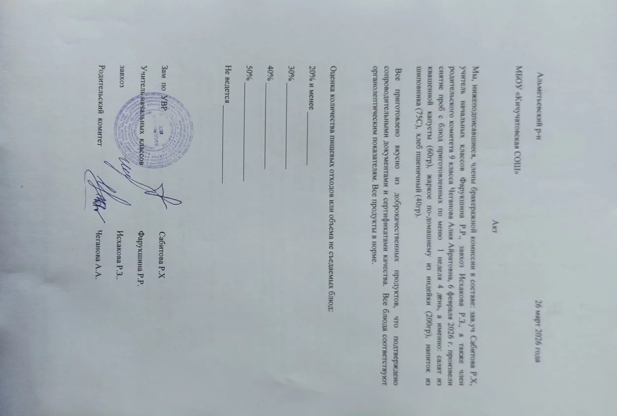 Акт проверки организации питания в школьной столовой от 26.03.2026 (родительский контроль)