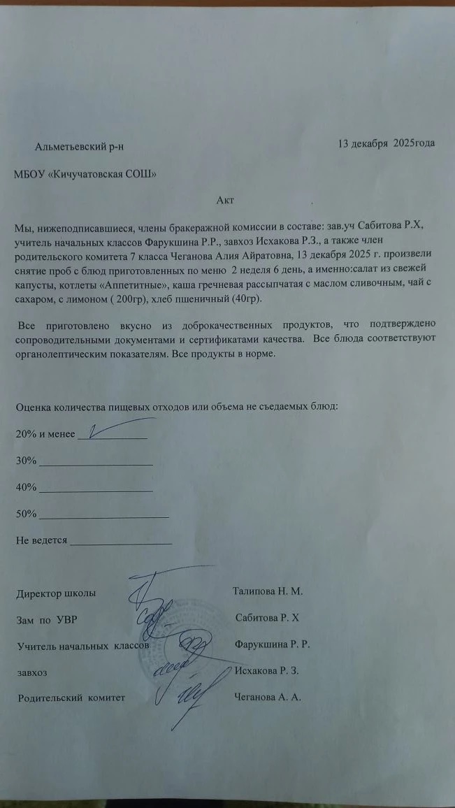 Акт проверки организации питания в школьной столовой (родительский контроль