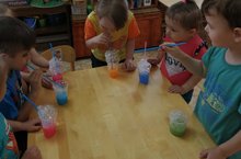 Сегодня ребята познакомились со способом изготовления мыльных пузырей, а также со свойством жидкого мыла.