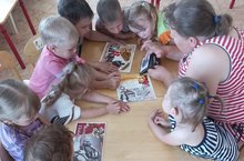 Реята расматривают картинки о войне.