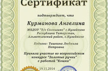 Наша воспитаница Курманаева Ангелина приняла участие во Всероссийском конкурсе "Золотые ручки" педагог Тишкина Людмила Петровна
