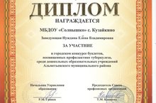 Заведующая ДОУ Нуждина Е.В. была награждена допломом за участие в городском конкурсе буклетов, посвященных профилактике туберкулеза , среди дошкольных образовательных учреждений Альметьевского муниципального района.