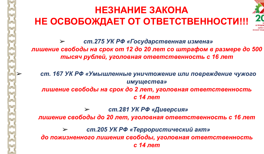 Во исполнение протокола заседания межведомственной рабочей группы по профилактике распространения среди детей и молодежи деструктивных движений, субкультуры массовых убийств, в том числе идеологии «Колумбайн», травли (буллинга), суицидальных проявлений от 10.02.2026 № ЛФ-12-38 Министерство образование и науки Республики Татарстан информирует об ответственности, предусмотренной статьями 167, 205, 275, 281 Уголовного кодекса Российской Федерации.