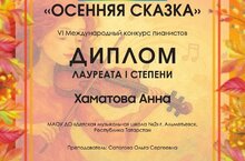 Поздравляем Хаматову Анну с дипломом Лауреата 1 степени на VI Международном конкурсе пианистов "Осенняя сказка ". А также преподавателя Сапогову Ольгу Сергеевну и директора Аксёнова Рамиса Ахмедовича!
