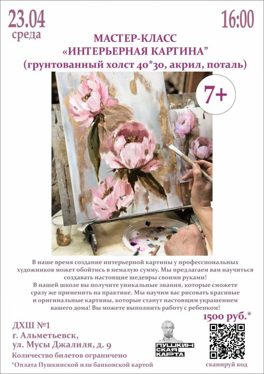 Размер: АЗ (40*30см)В наше время создание интерьерной картины у профессиональных художников может обойтись в немалую сумму. Мы предлагаем вам научиться создавать настоящие шедевры своими руками! В нашей школе вы получите уникальные знания, которые сможете сразу же применить на практике. Мы научим вас рисовать красивые и оригинальные картины, которые станут настоящим украшением вашего дома!
