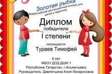 26.12.2016. На Всероссийском дистанционном конкурсе для детей и педагогов "Золотая рыбка" в номинации:"Вокальное исполнительство" Тураев Тимофей (преп. Давлетшина А.Л.) получил Диплом I степени. Поздравляем!