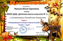 II Международный интернет конкурс творческих работ "Сказки-чудо" прошел в г. Чебоксары. Учащаяся ДШИ №1 Гадобоева М.Д. заняла 2 место. преподаватель - Чадаева С.Ю.