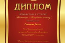 Учащаяся Савельева Диана преподавателя Решетниковой Ирины Владимировны приняла участие и стала победителем I степени в Всероссийском дистанционном конкурсе творческих работ детей и подростков в номинации " Разноцветный листопад".