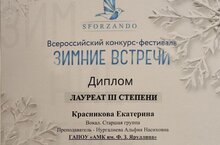 В ДК "Иске Элмэт" состоялся Всероссийский конкурс-фестиваль "Зимние встречи", в котором студентка 1 курса специальности "Вокальное искусство" Екатерина Красникова завоевала звание "Лауреат lll степени".Мы поздравляем Екатерину и преподавателя, руководителя ПЦК "Вокальное искусство" Альфию Насиховну Нургалиеву и желаем новых побед и успехов!