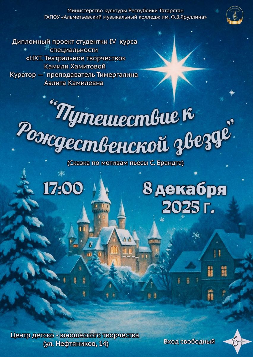 8 декабря 2025г.- Дипломный спектакль студентки 4 курса специальности "НХТ.Театральное творчество" Камили Хамитовой-сказка по мотивам пьесы С.Брандта "Путешествие к Рождественской звезде" /upload/storage/org6179/files/0bed984f-828d-4fc0-9a15-5a069d17c0c5.jpg