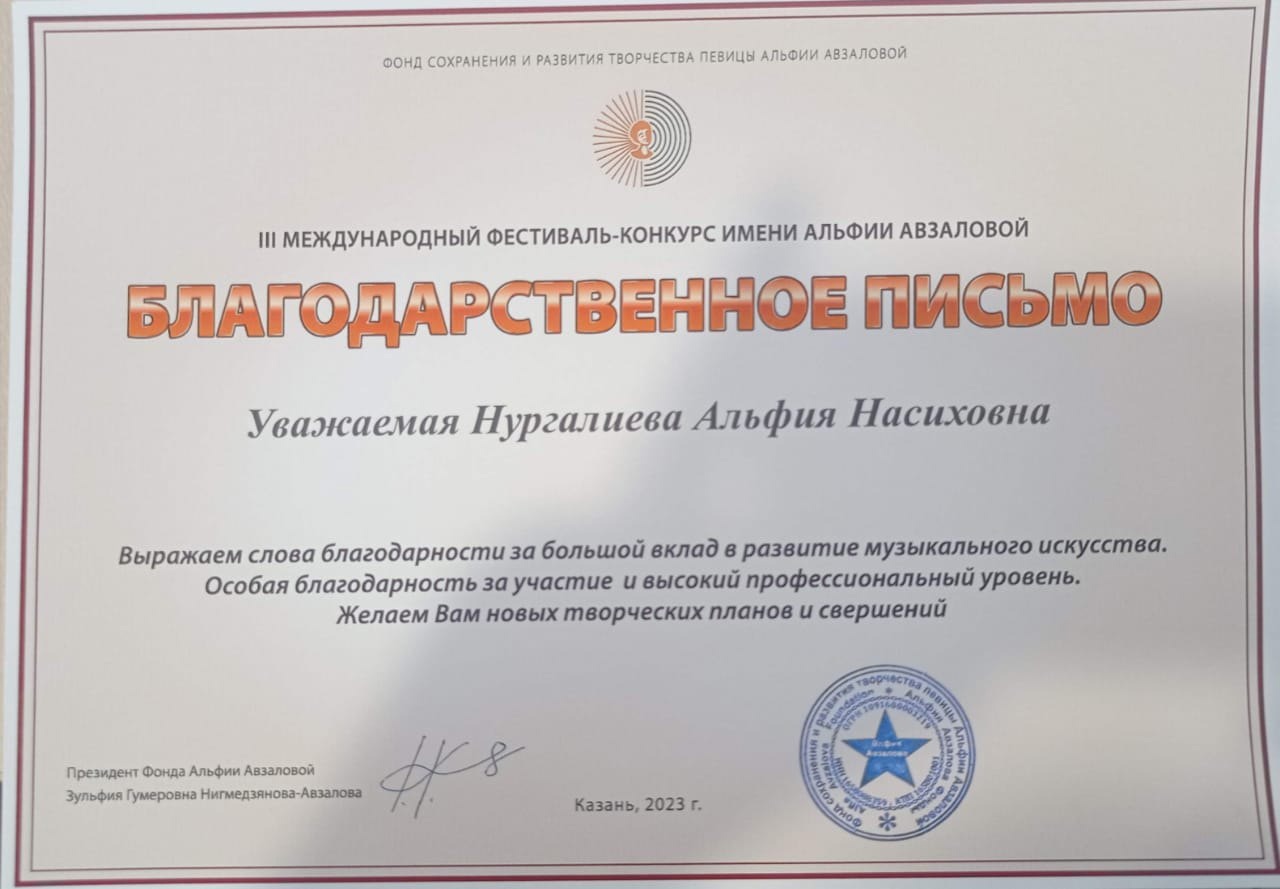 Преподаватель, заведующая ПЦК Нургалиева Альфия Насиховна была награждена благодарственным письмом оргкомитета за большой вклад в развитие музыкального искусства.