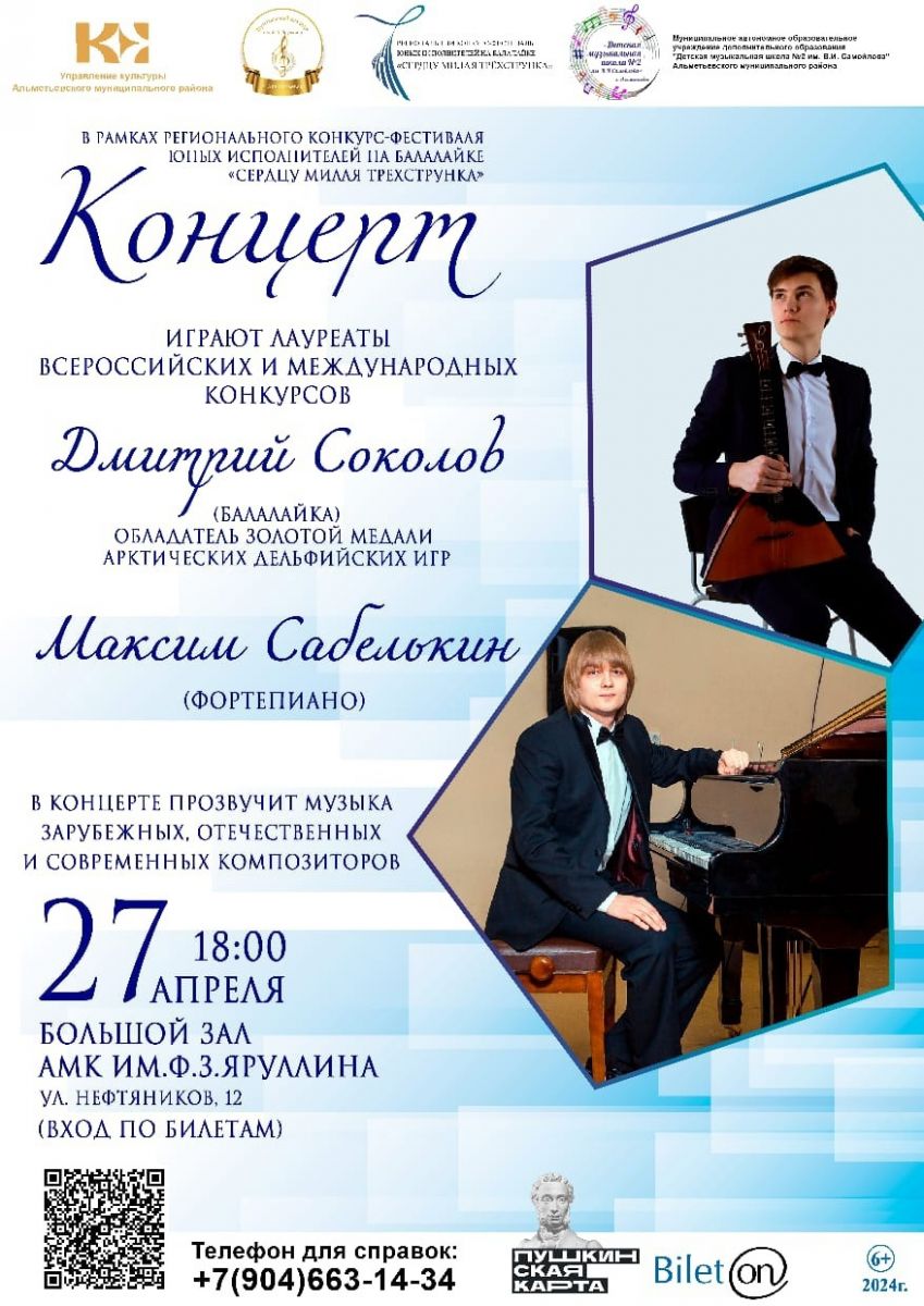 Концерт в рамках I Регионального конкурса-фестиваля "Сердцу милая трехструнка" лауреата Всероссийских и международных конкурсов, обладателя золотой медали первых Арктических- дельфийских игр Дмитрия Соколова (балалайка) , партия фортепиано -лауреат Всероссийских и международных конкурсов Максим Сабелькин.