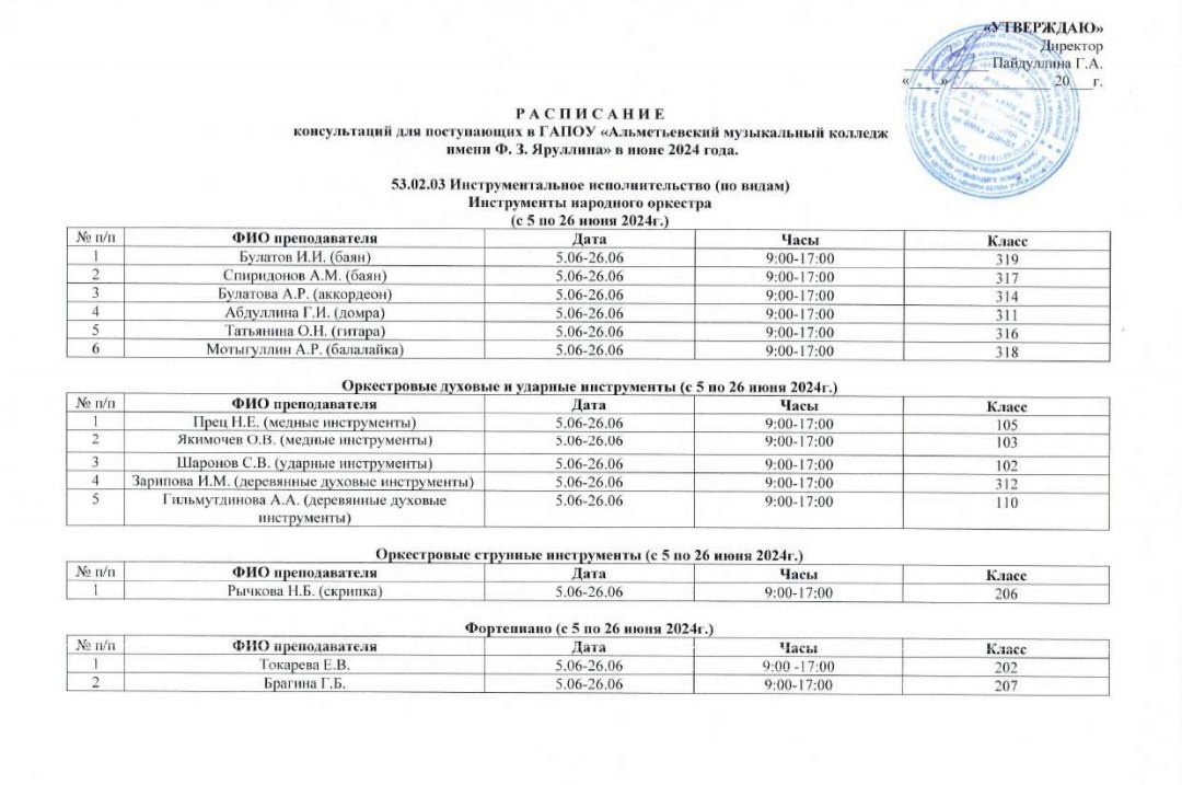 Расписание консультаций для поступающих в Альметьевский музыкальный колледж им.Ф.З.Яруллина.