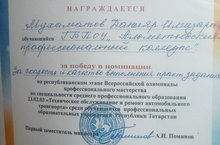 5-6 апреля на базе Нижнекамского агропромышленного колледжа прошел республиканский этап Всероссийской олимпиады профессионального мастерства по специальности СПО 23.02.03 "Техническое обслуживание и ремонт автомобильного транспорта". Мухаматов Данияр (31СТО) награжден дипломом за победу в номинации "За скорость и качество выполнения практического задания". Руководитель Маслова Т.Л.