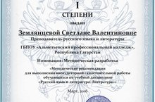 Преподаватель русского языка и литературы Землянцева С.В. принимала участие во Всероссийском конкурсе с международным участием "Современные методы преподавания" в номинации "Методическая разработка" получила диплом 1 степени.
