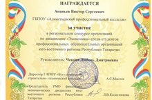 Студенты нашего колледжа Ананьев В. и Миронов Н. (21 НМР) под руководством Чековой Л.Д. приняли участие в Региональном конкурсе презентаций по дисциплине "Экономика" среди студентов профессиональных образовательных организаций юго-восточного региона РТ, организованном ГАПОУ "Бугульминский строительно-технический колледж"