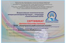 26.03. 2016г. студенты нашего колледжа Шевченко А.(31СТМ), Даведов Н.(31СТМ), Яббаров Т.(31СТМ), Попов А.(31СТМ), Хафизов Р.(21СТМ), Хундиряков В.(21 СТМ), - руководитель Елисеева Е.В., Даутов Т.(31СТО), Аникин А.(31СТО), Хафизов Т.(31СТО) - руководитель Маслова Т.Л., Джураев Ш.(31СЭМ), Мартынов М.(31СЭМ) - руководитель Михайлова С.М. приняли активное участие во Всероссийской политехнической междисциплинарной олимпиаде организованной ГАПОУ "Нижнекамский агропромышленный колледж", Джураев Ш. и Мартынов М. заняли 3 место.