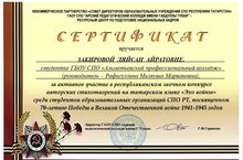 Закирова Лейсан (гр.21 СТМ) награждена сертификатом за активное участие в Республиканском заочном конкурсе авторских стихотворений на татарском языке "Эхо Войны" среди студентов образовательных организаций СПО РТ, посвященном 70-летию Победы в ВОВ 1941-1945 гг.