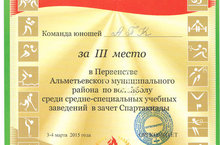 Команда юношей нашего колледжа в Первенстве Альметьевского муниципального района по волейболу среди средне-специальных учебных заведений заняла III место. Поздравляем!