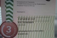 Поздравляем Гараева Булата Рустемовича, занявшего 3 место в компетенции "ПРОМЫШЛЕННАЯ МЕХАНИКА И МОНТАЖ" в Региональном этапе Чемпионата по профессиональному мастерству «Профессионалы» - 2023 Республики Татарстан!