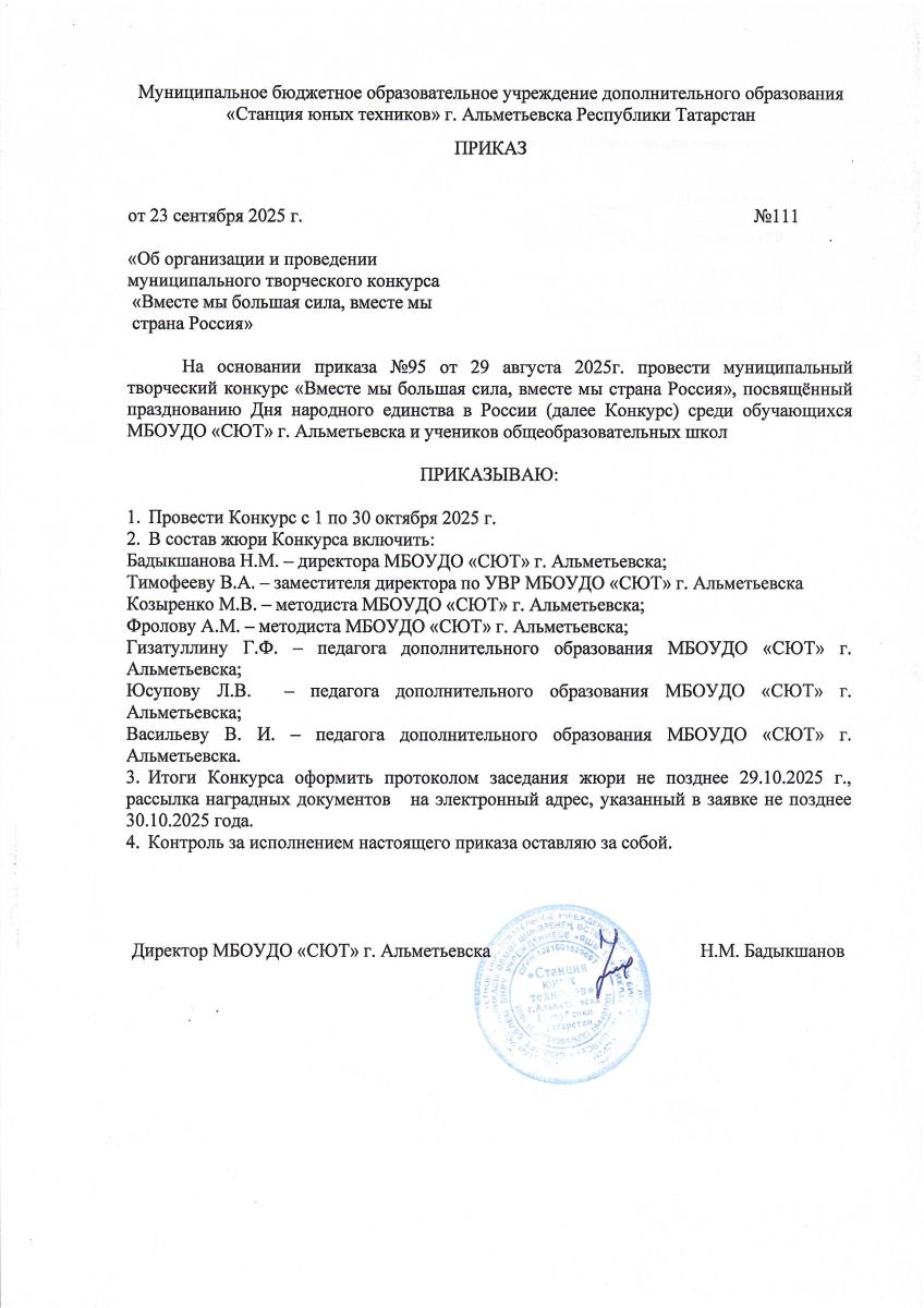 Приказ об организации и проведении муниципального творческого конкурса "Вместе мы большая сила, вместе мы страна Россия"