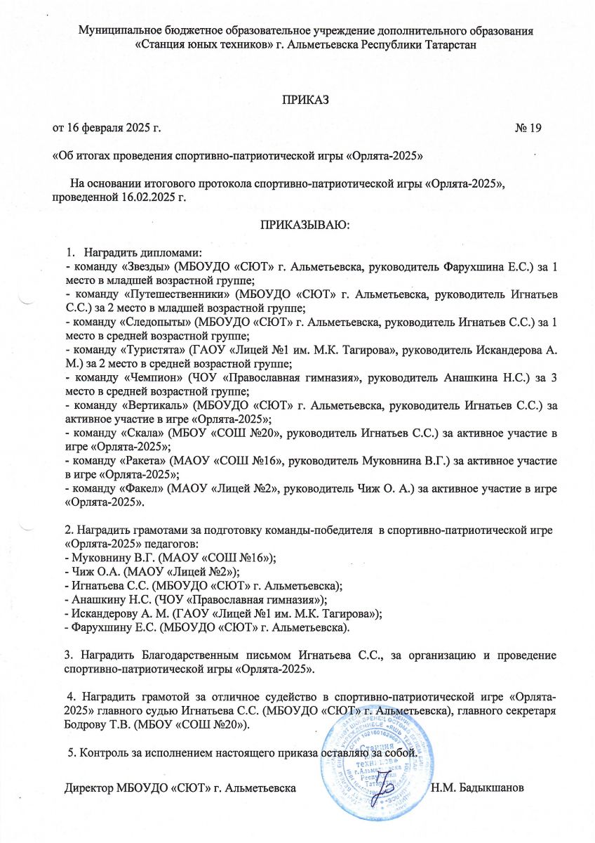 Приказ об итогах спортивно-патриотической игры "Орлята-2025"