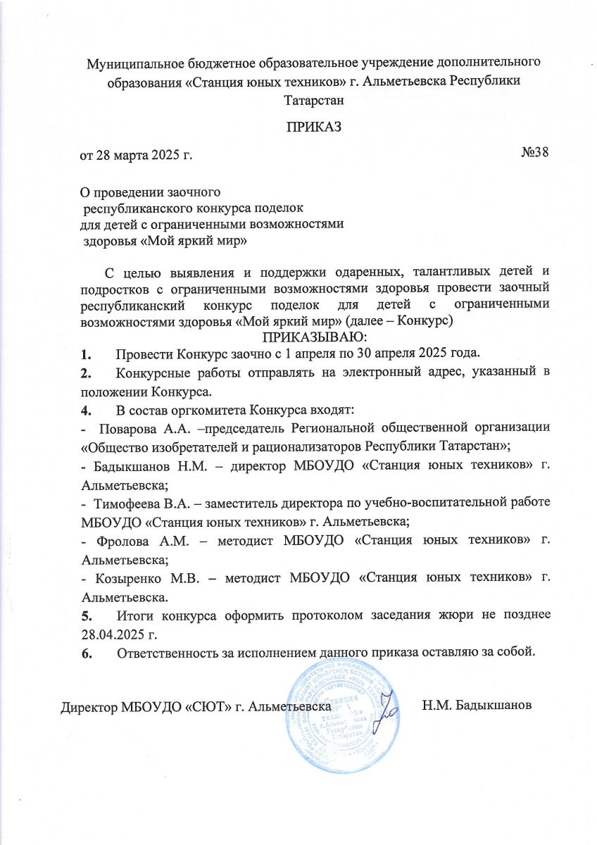 Приказ о проведение заочного республиканского конкурса поделок для детей с ограниченными возможностями здоровья «Мой яркий мир»