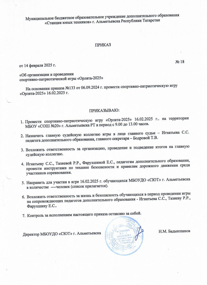 Приказ о проведении о спортивно - патриотической игры "Орлята - 2023", посвященный дню Защитника Отечества среди обучающихся учреждений дополнительного образования, общеобразовательных школ г. Альметьевска РТ