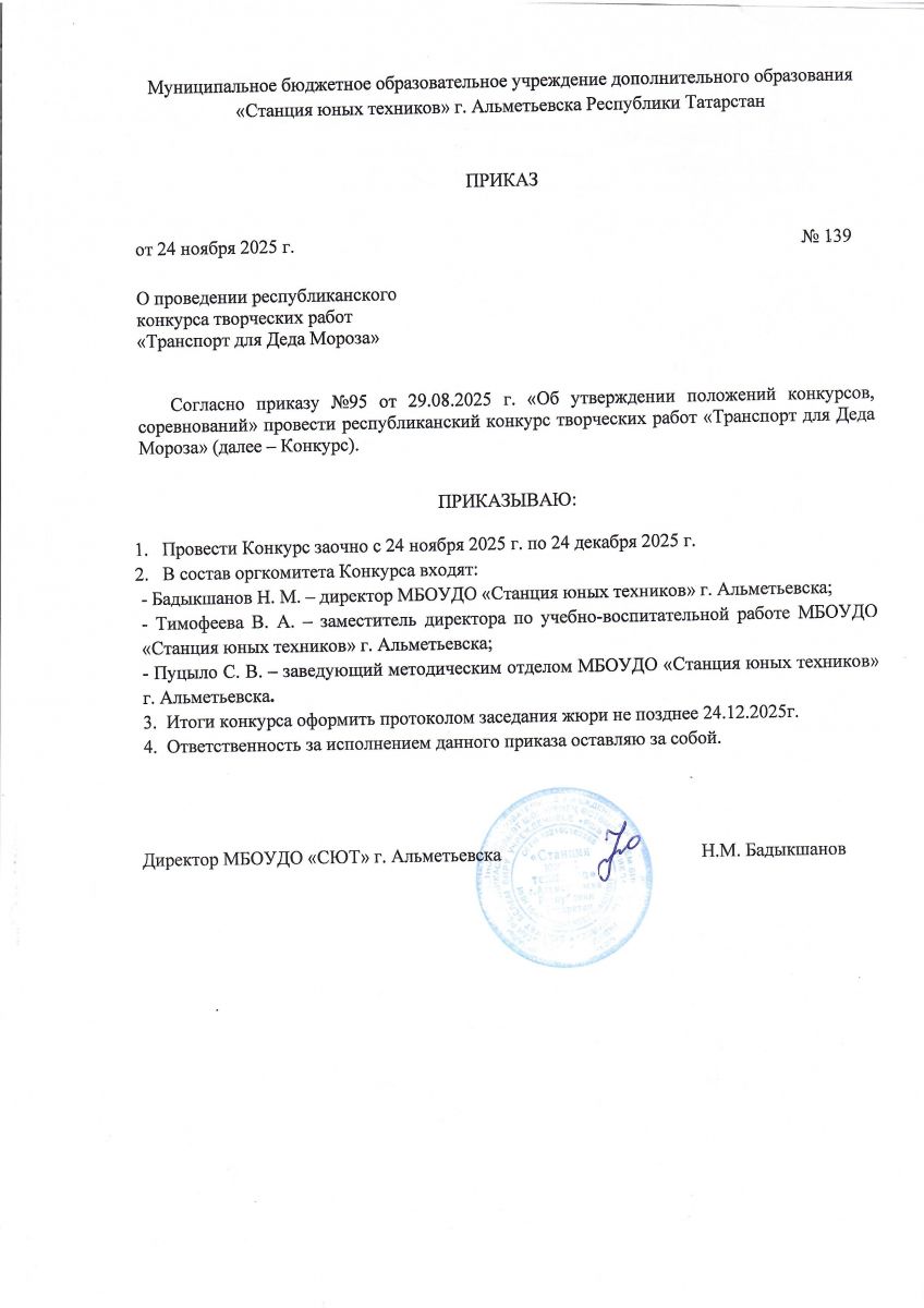Приказ о проведении Республиканского конкурса творческих работ "Новогодний транспорт для Деда Мороза"