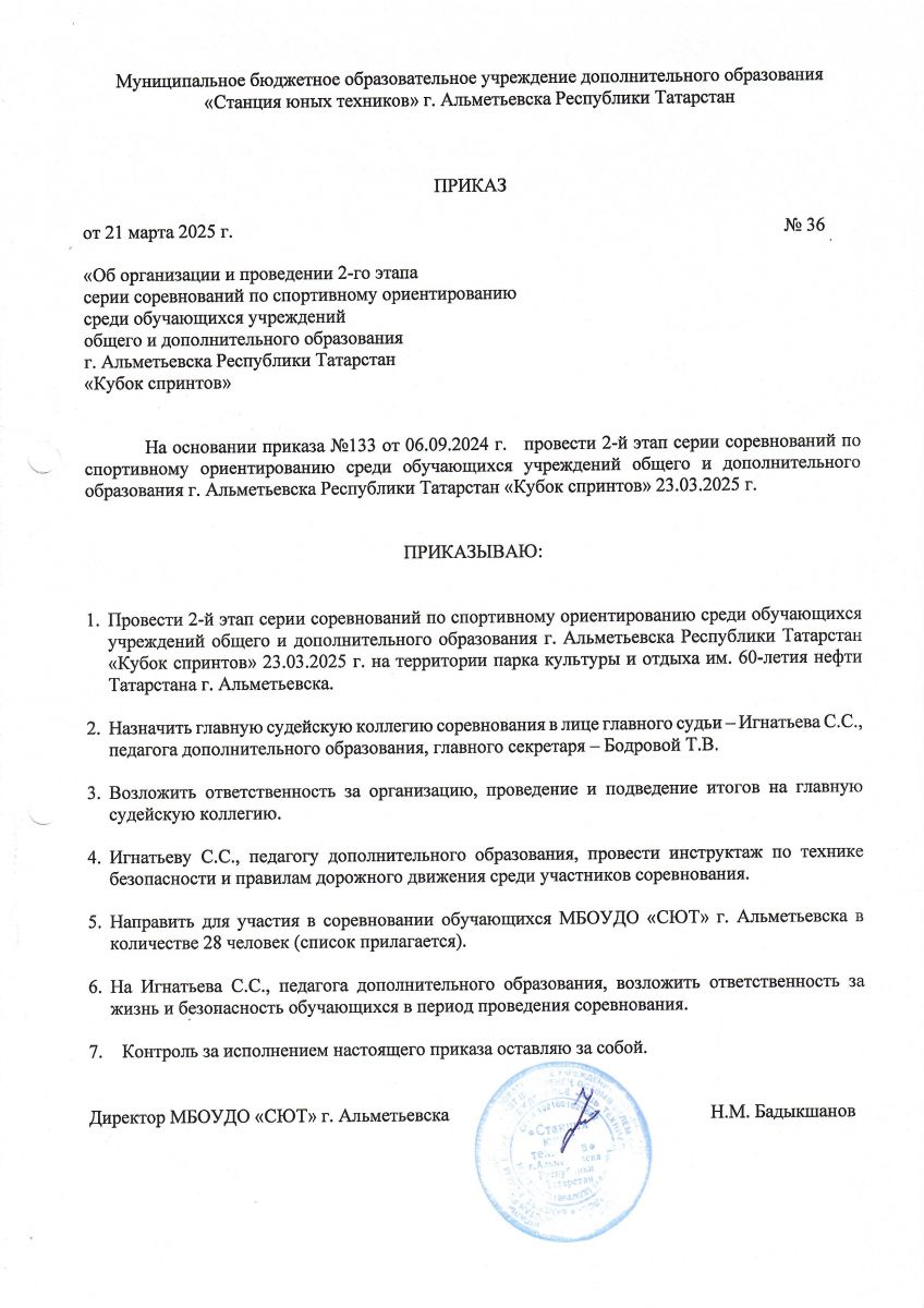 Приказ об организации и проведении 2 - го этапа серии спринтов по спортивному ориентированию в дисциплине "городской спринт" среди учащихся г. Альметьевска РТ "Кубок спринтов"
