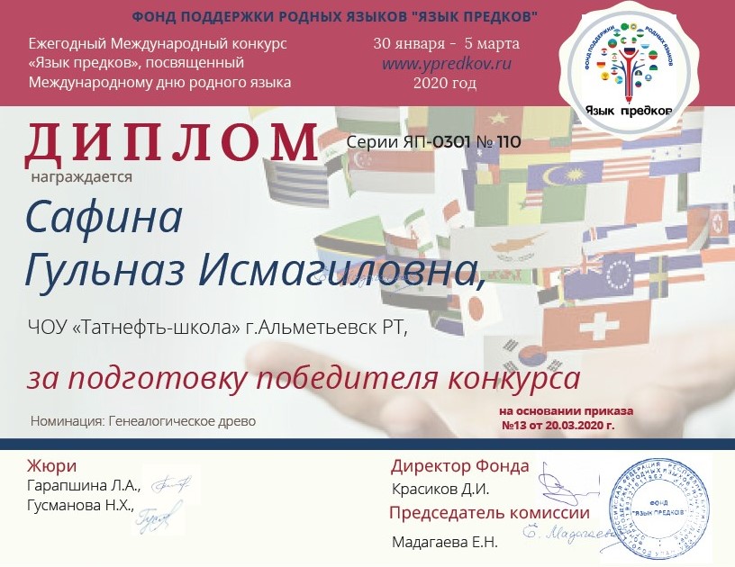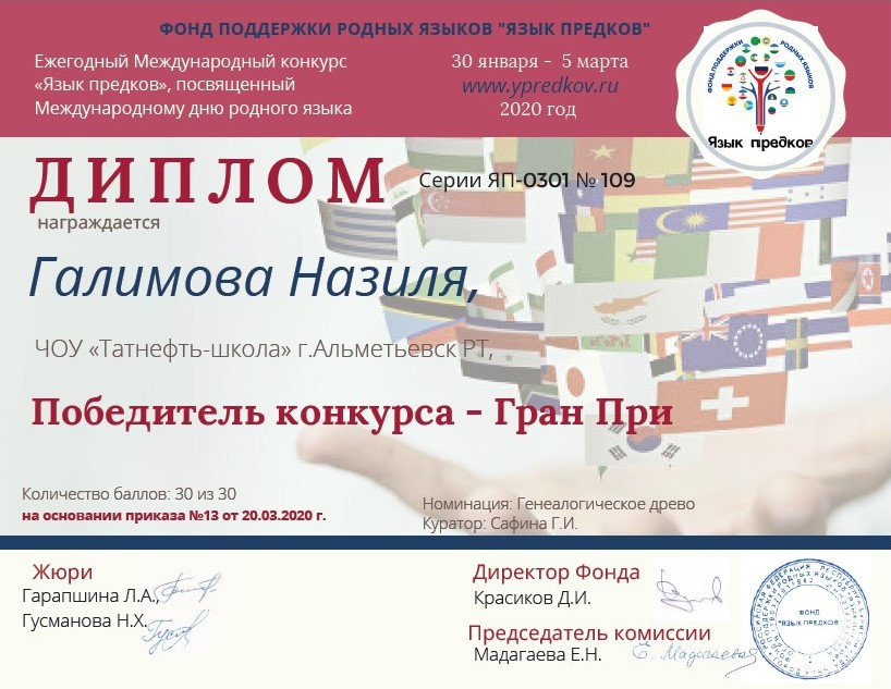 Международный конкурс "Язык предков" 07.04.2020С 30 января по 5 марта 2020 года Фонд «Язык предков», созданный для поддержки родных языков народов, проживающих на территории России, проводил ежегодный Международный конкурс «Язык предков», посвященный Международному дню родного языка. На конкурс поступило 359 работ из разных регионов России и стран ближнего зарубежья. Представлены почти 20 языков разных народностей.Галимова Назиля, ученица 4 класса ЧОУ «Татнефть-школа», участвовала в этом конкурсе и стала победителем конкурса – Гран При в номинации Генеалогическое дерево! 30 баллов из 30!