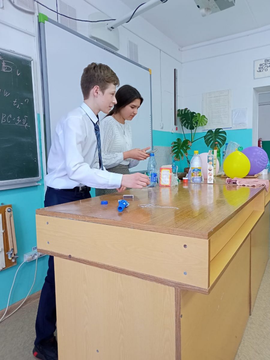 Ученики 8 класса Саватнеев Владислав и Жуковская Эмилия провели час занимательной физики перед учащимися младших классов, показав интересные опыты без приборов