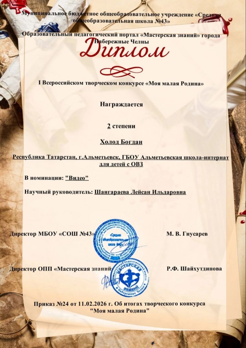 Ученик 6 класса нашей школы-интерната Холод Богдан занял второе место во Всероссийском творческом конкурсе "Моя малая Родина", состоявшемся в г.Набережные Челны, по номинации "Видео". Руководитель: учитель математики Шангараева Л.И. Поздравляем! -