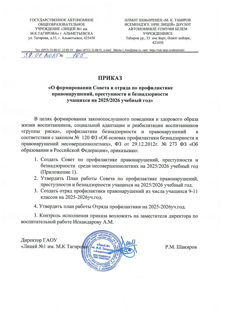 Приказ о формировании совета и отряда по профилактике