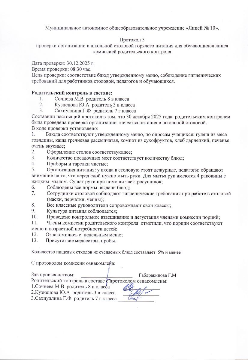 Родительский контроль за качеством питания в МАОУ "Лицей №10" от 30 декабря 2025 года