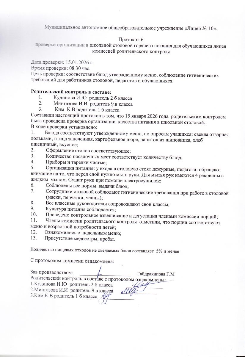 Родительский контроль за качеством питания в МАОУ "Лицей №10" от 15 января 2026 года