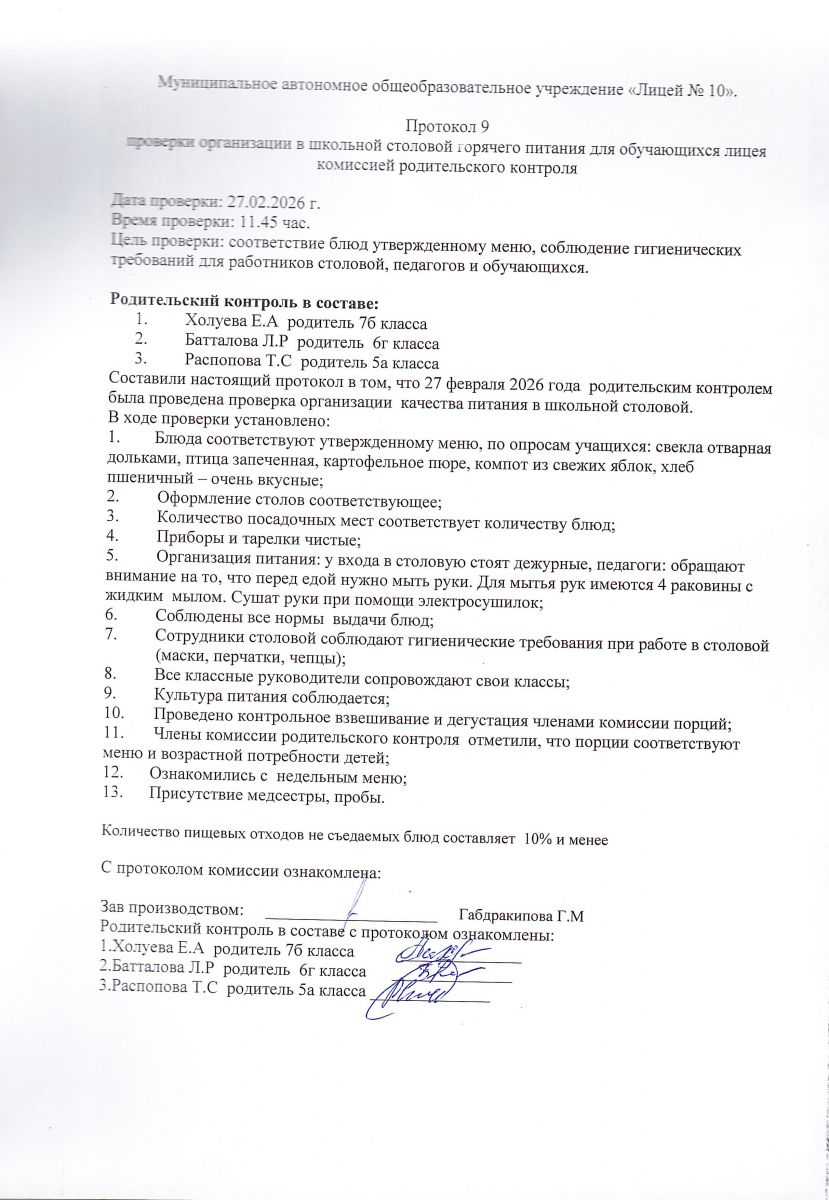Родительский контроль за качеством питания в МАОУ "Лицей № 10" от 27 февраля 2026 год