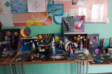 Наша школьная выставка ко Дню космонавтики уже открыта. Приглашаем всех желающих посмотреть на юные таланты!
