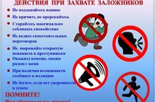 Если ты оказался в заложниках, знай - ты не один. Помни: опытные люди уже спешат к тебе на помощь. Не пытайся убежать, вырваться самостоятельно - террористы могут отреагировать агрессивно. Постарайся успокоиться и жди освобождения. 1. Настройся на долгое ожидание. Специалистам требуется время, чтобы освободить тебя. Они не теряют ни минуты, но должны всё предусмотреть. 2. Постарайся мысленно отвлечься от происходящего: вспоминай содержание книг, художественных фильмов, мультфильмов, решай в уме задачи. Если веришь в Бога, молись. 3. Старайся не раздражать террористов: не кричи, не плачь, не возмущайся. Не требуй также немедленного освобождения - это невозможно. 4. Не вступай в споры с террористами, выполняй все их требования. Помни: это вынужденная мера, ты спасаешь себя и окружающих. 5. Помни, что, возможно, тебе придётся долгое время провести без воды и пищи - экономь свои силы. 6. Если в помещении душно, постарайся меньше двигаться, чтобы экономнее расходовать кислород. 7. Если воздуха достаточно, а по зданию передвигаться запрещают, делай нехитрые физические упражнения - напрягай и расслабляй мышцы рук, ног, спины. Не делай резких движений. 8. Помни: если заложник проводит много времени с террористами, ему может показаться, что они вместе, а весь мир - против них. Это очень опасная ошибка! Знай: в любой ситуации террорист - это преступник, а заложник - его жертва! У них не может быть общих целей!