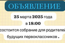 25 МАРТА 2025 ГОДА В 18:00 СОСТОИТСЯ СОБРАНИЕ ДЛЯ РОДИТЕЛЕЙ БУДУЩИХ ПЕРВОКЛАССНИКОВ 13.03.2025