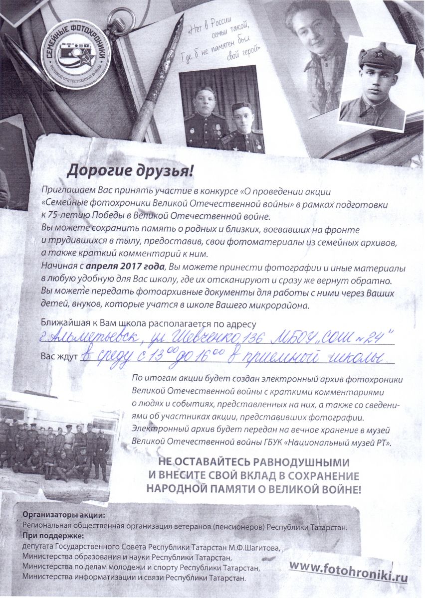 Приглашаем Вас принять участие в Республиканском конкурсе «Семейные фотохроники Великой Отечественной войны» в рамках подготовки к празднованию Дня Победы в Великой Отечественной войне. Вы можете принести фотографии своих дедов, прадедов, бабушек, братьев, мужей для создания фотоархива военных лет. В Вашем присутствии оргкомитет сделает электронный вариант фотографий и вернет обратно. Ждем вас каждую среду с 13.00 до 16.00 в приемной школы №24. Очень надеемся, что вы поддержите наше желание увековечить память ваших родных и близких.