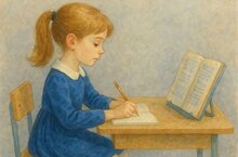 Тетрадь и книга: Учебник лучше поставить на подставку, а тетрадь расположить под углом 30° относительно края стола. Это помогает держать голову ровно.
