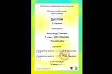 15 января 2013г. в он-лайн режиме проходил очередной Всероссийский конкурс по математике "Быки и коровы", в котором ученик 6б класса Пиянзин Александр занял 3- место и получил диплом. Поздравляем Сашу с очередной победой!