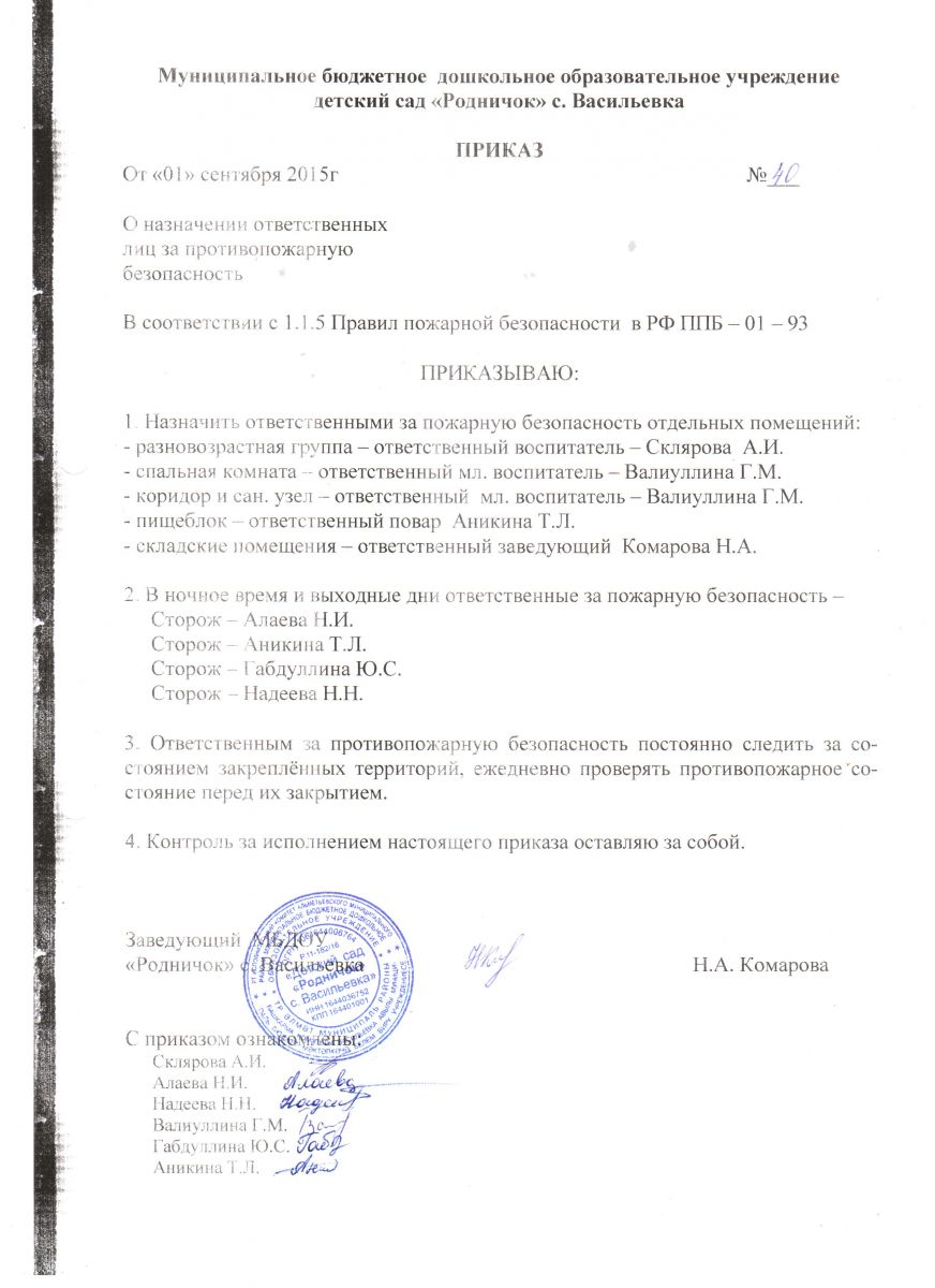 Приказ № 40 от 01.09.2015 г. "О назначении ответственных за пожарную безопасность"