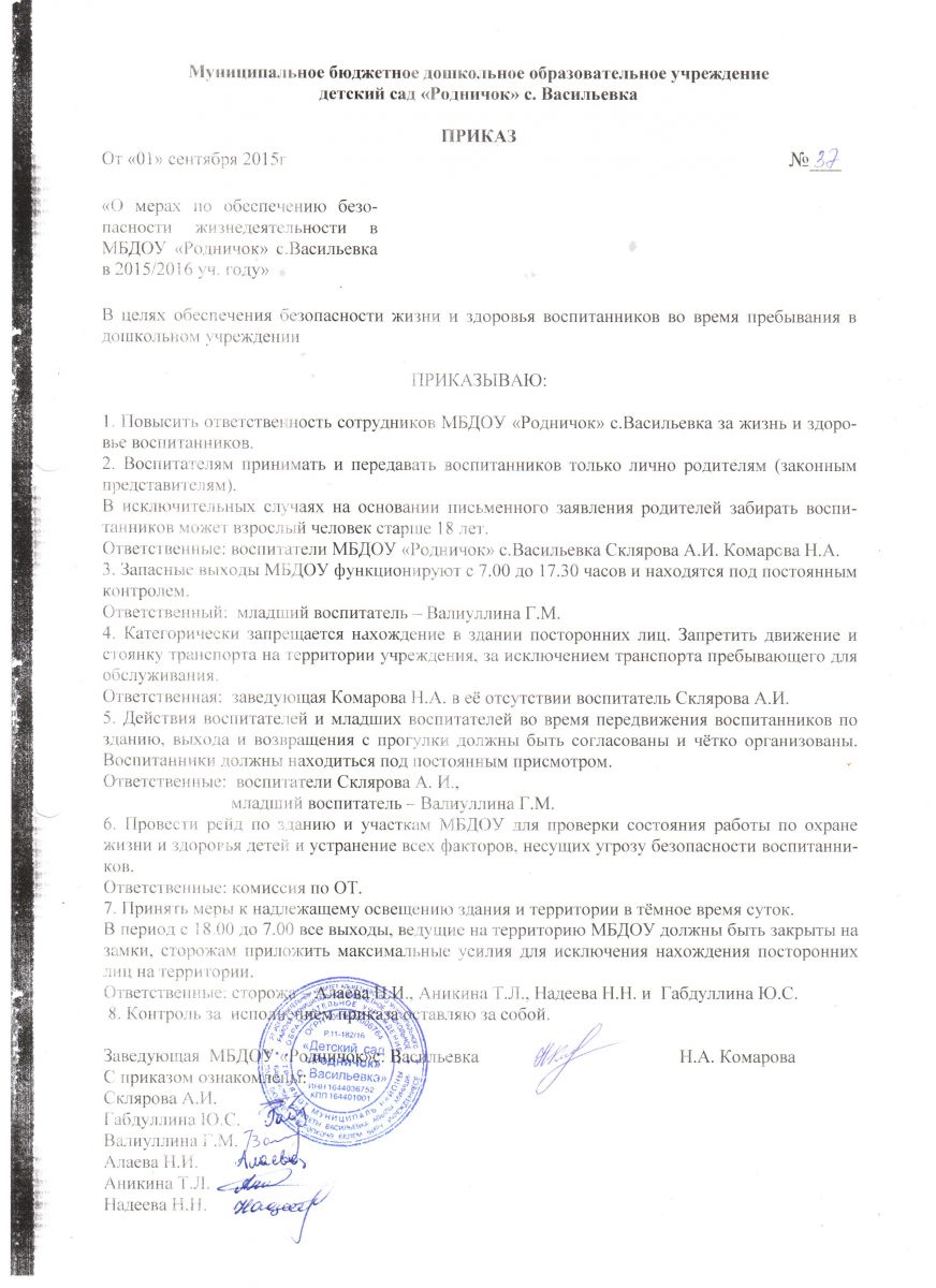 Приказ ДОУ № 37 от 01.09.2015 "О мерах по обеспечению безопастности жизнедеятельности"