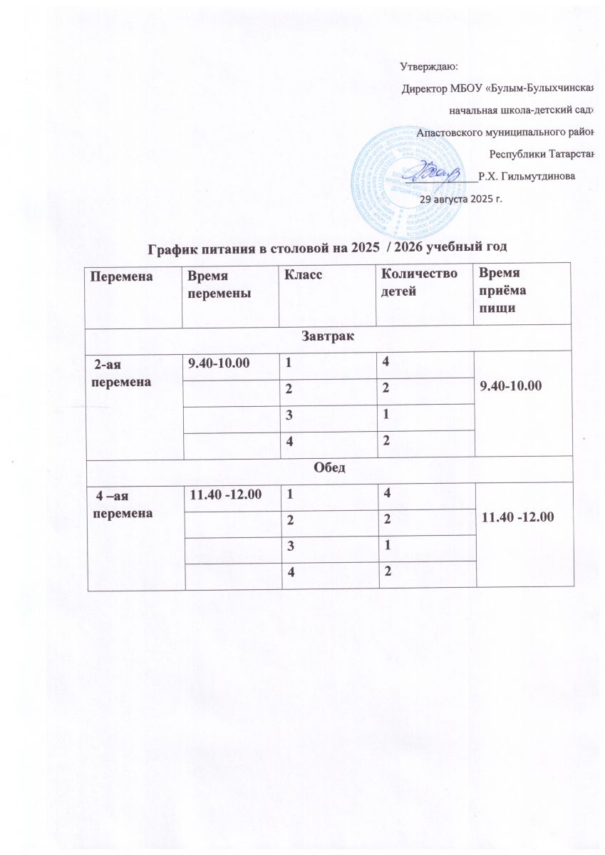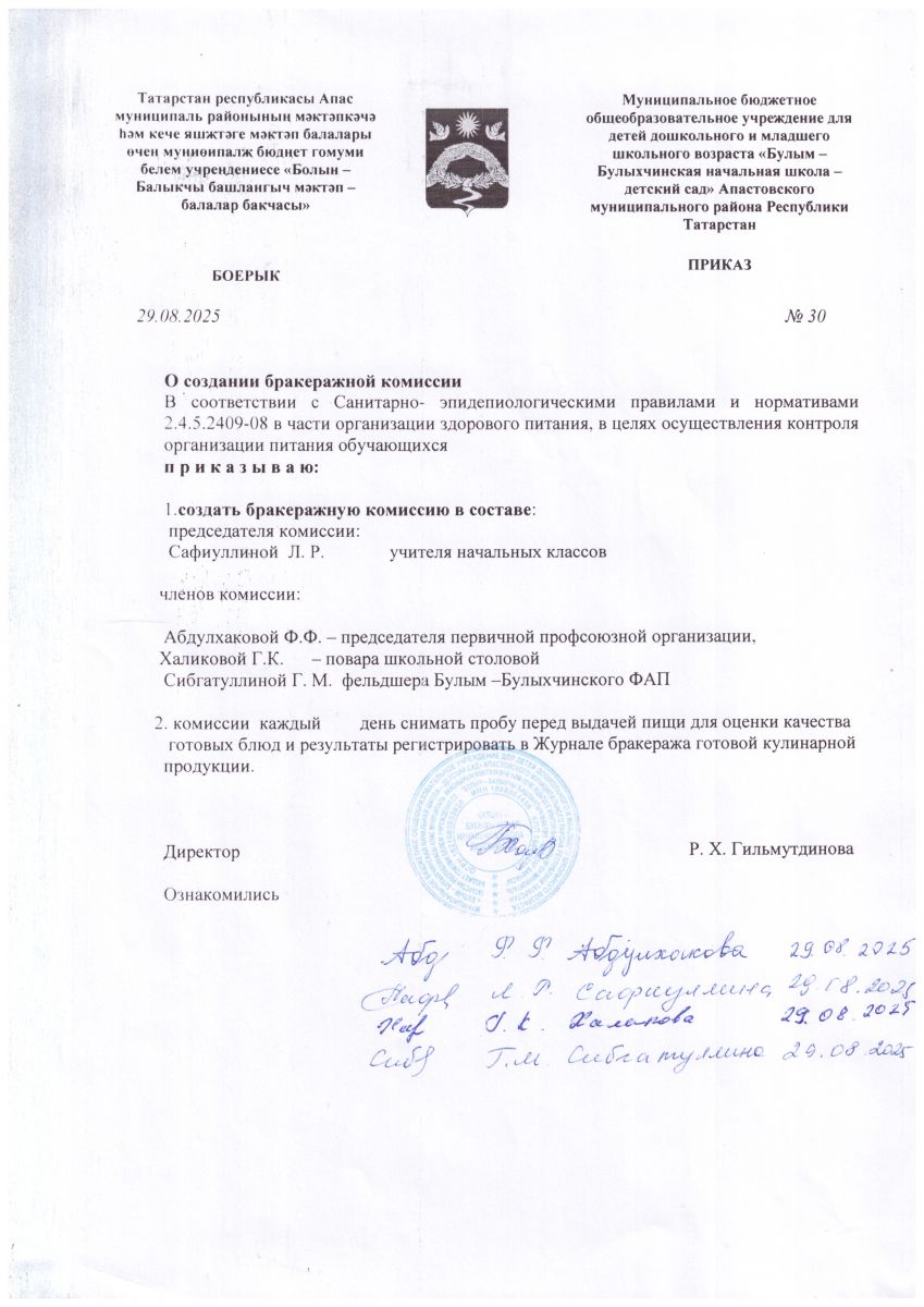 Горячая линия по организации горячего питания в 2024/2025 учебном году МБОУ "Булым -Булыхчинская начальная школа-детский сад" Апастовского муниципального района Республики Татарстан